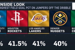 本赛季运球后跳投命中率前五:雷霆44%最高 火箭湖人掘金绿军上榜