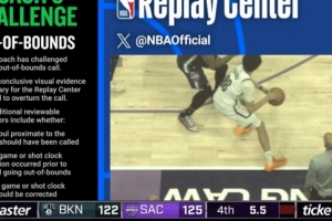 特拉奥雷被两位裁判同时吹踩线和进攻犯规,篮网挑战失败,裁判回放后明显踩线,还是国王球权