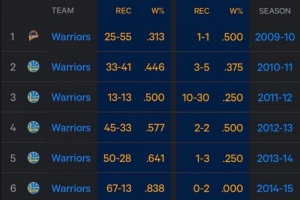库里缺席时勇士战绩9-16,胜率36.0%