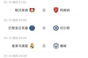 欧冠1/8决赛首回合踢完4场比赛,英超3队出战一场未胜。明日欧冠1/8决赛另外四场比赛的较量即将上演,药厂vs阿森纳,巴黎vs切尔西,皇马vs曼城,博德闪耀vs葡体。