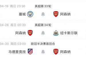 体育资讯04月16日讯 阿森纳淘汰葡萄牙体育,晋级欧冠半决赛,继续在英超和欧冠双线争冠。4月剩余比赛中,阿森纳将接连迎来曼城、纽卡和马竞的挑战。